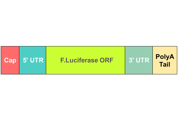 Firefly luciferase mRNA encodes a 550-amino acid oxidoreductase enzyme derived from the North American firefly Photinus pyralis that catalyzes the ATP- and oxygen-dependent oxidative decarboxylation of its substrate D-luciferin, producing oxyluciferin and a characteristic yellow-green bioluminescent emission at ~560 nm. Unlike fluorescent reporters such as eGFP and mCherry, firefly luciferase generates its own light signal without the need for external excitation, resulting in an exceptionally low background signal and an extremely wide dynamic range — spanning up to seven orders of magnitude. In its native form, firefly luciferase is targeted to peroxisomes via a C-terminal serine-lysine-leucine (SKL) tripeptide targeting signal (Gould et al., 1989). In this construct, SKL has been replaced with IAV, abolishing peroxisomal import and resulting in uniform cytosolic distribution of the translated protein. The mRNA sequence includes a codon-optimized coding sequence bearing a 5' Cap1 structure and poly(A) tail to support efficient translation in both cell-free and cellular systems. Because the reaction requires exogenous luciferin substrate, luciferase activity can be precisely controlled, enabling real-time, substrate-gated detection of mRNA translation.