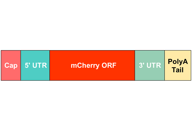 mCherry mRNA encodes a monomeric red fluorescent protein (RFP) derived from DsRed, a tetrameric fluorescent protein originally isolated from Discosoma sp. coral. It was engineered through directed evolution of mRFP1 by the Tsien laboratory to improve brightness, photostability, and maturation speed. mCherry exhibits excitation and emission maxima at approximately 587 nm and 610 nm, respectively, producing a bright red fluorescence well-suited for multicolor imaging and FRET applications. Its monomeric nature prevents the artifactual protein aggregation associated with oligomeric RFPs, making it ideal as a fusion tag for live-cell imaging, subcellular localization studies, and reporter assays.